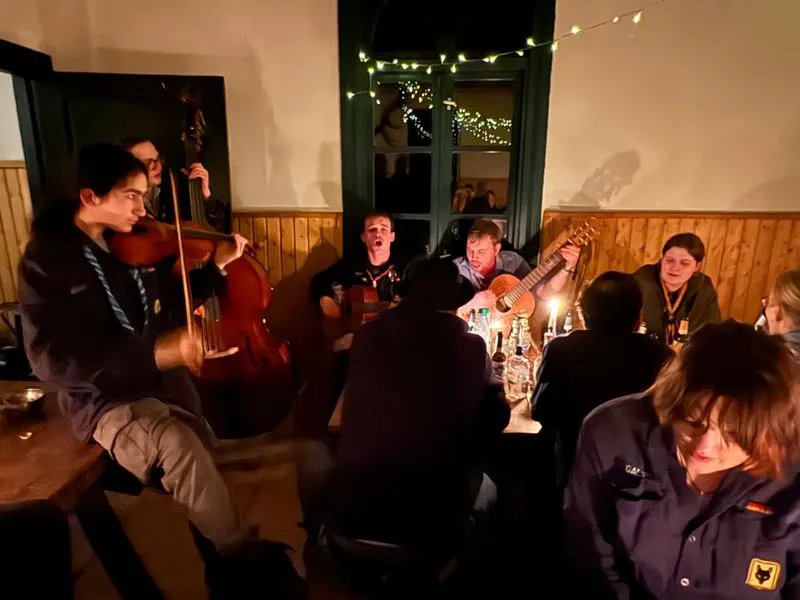 Beim Kohlgang sorgten lustige Spiele für beste Stimmung, und immer wieder stimmten wir fröhliche Lieder an. Höhepunkt des Tages war das üppige Festmahl mit Grünkohl, Pinkel und allem, was dazugehört, feierlich eröffnet mit dem traditionellen Grünkohllied. Bis tief in die Nacht erklangen Violine, Gitarren und Kontrabass, und wir sangen und feierten gemeinsam.